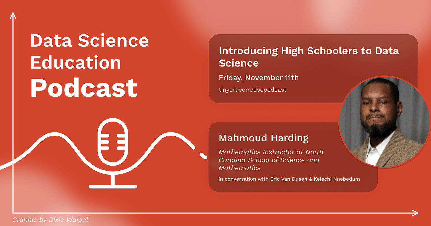 In today’s episode, we speak with Mahmoud Harding, who is a math instructor at North Carolina School of Science and Mathematics. At NCSSM, he teaches an introductory data science class based off of UC Berkeley’s Foundations of Data Science course. Today, he tells us about his experience bringing data science to high schoolers and how they’ve been reacting to the course. He also shares how he sees the future of data science education in high school and why it’s so important to teach high school students how to work with data.