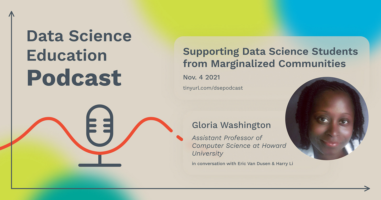 In this episode, Gloria Washington, an assistant professor at Howard University, shares her experiences structuring her Data Science-driven course to accommodate students who may be hesitant to join the field; through this discussion, she also urges institutions to construct their Data Science curriculum with marginalized communities in mind. Later in the conversation, Gloria speaks on her research that utilizes human-centered data.