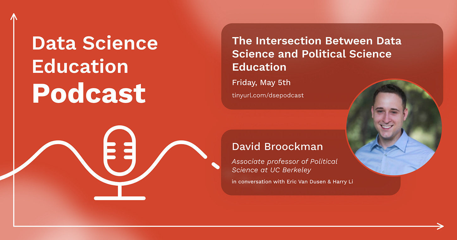 In this episode, David Broockman, an associate professor of political science at UC Berkeley, shares his perspective on how the fields of data science and political science intersect within coursework. David shares his experiences with teaching PoliSci3, a course that introduces statistics and data science to political science students. He also discusses his team-based approach to teaching the course and expresses the importance of pushing students out of their comfort zone.